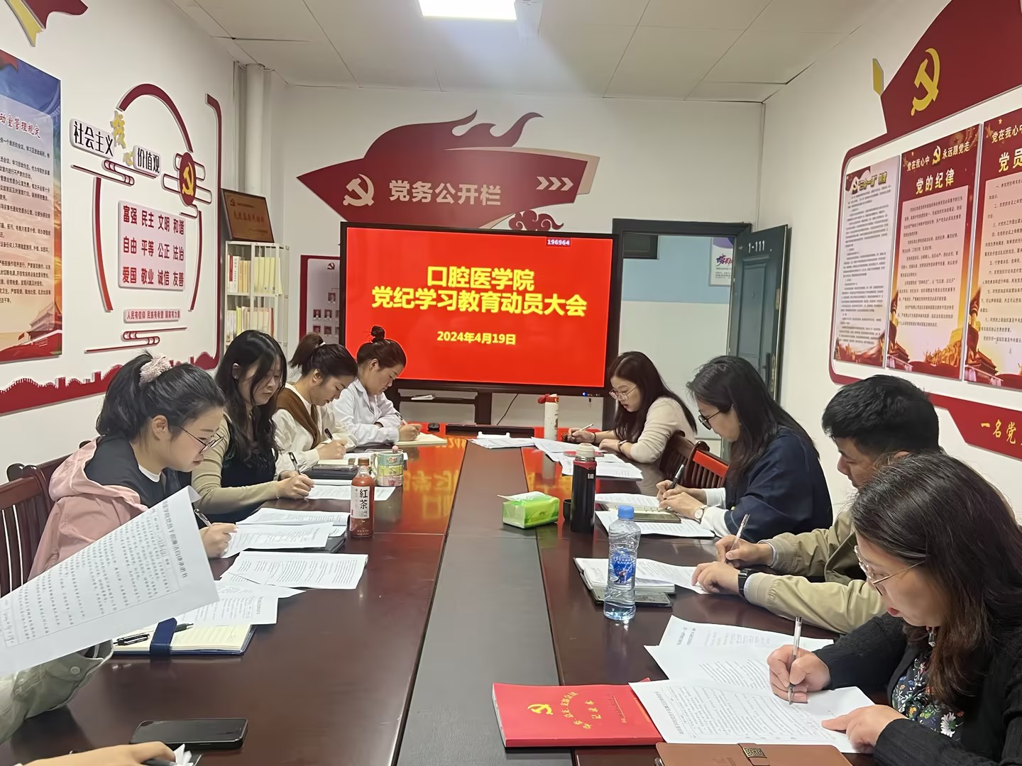 4月19日,v站体育官网召开党总支(扩大)会议,传达学习省委、省卫生健康委以及学校关于党纪学习教育有关会议精神,动员部署开展党纪学习教育工作。学院党总支副书记罗志红主持会议并讲话,学院党总支委员及各教研室主任参会。