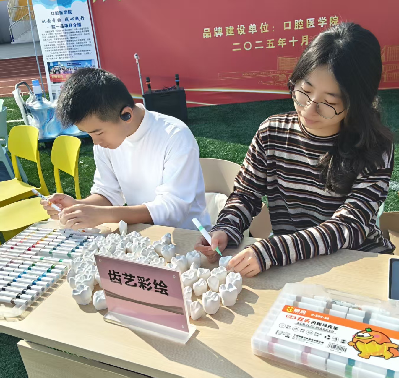 活动以“融合专业、实践、文化与趣味”为核心主题,聚焦口腔医学专业教育、劳动精神培育、中华文化传承及师生互动交流,吸引全校师生积极参与,现场氛围热烈。展示以集章兑奖机制展开,参与者在义诊区享免费口腔检查与健康科普、在知识答题区闯关学护齿知识、在静品茶区感受茶文化、在漆扇制作与 “齿” 艺彩绘区发挥创意、在古韵投壶区体验传统游戏,各环节完成后可集章兑换香囊、护齿用品、生活用品等丰富奖品,沉浸式体验兼具专业性与趣味性。
