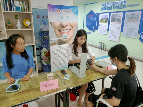 国庆节便民惠民活动期间,v站体育官网参与志愿服务的师生给前来咨询的学生进行血压测量及口腔检查,讲解牙齿出现的问题、病灶,给予针对性的护理或治疗方案,发放口腔保健宣传资料,并提醒口腔保健的细节问题。