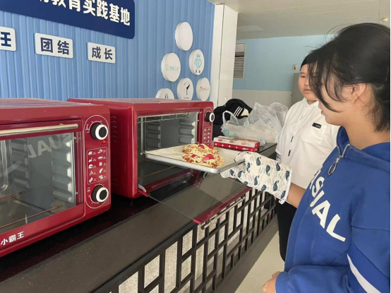 上午10点,活动正式开始。工作人员早早布置了活动场地,并准备好了食材、抹刀、烤箱等材料工具。在认真听完老师关于手工披萨的制作步骤后,同学们已经跃跃欲试,纷纷戴起手套,便开始享受劳动带来的乐趣,大家你一言我一语,分工协作、互帮互助,气氛和谐融洽。随着一个个富有特点的披萨新鲜出炉,空气中都弥漫着浓浓的香甜,大家交流着制作的想法和过程中的不足,脸上挂满了幸福的笑容。